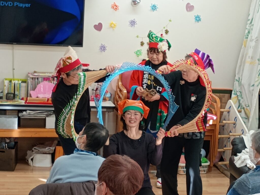 南京玉すだれ イベント 2026.01.12 1月11日 日曜日 乙女会の皆さまが 南京玉すだれを披露してくださいました(^O^)/ お弟子さんたちも加わり、大人数での玉すだれは 圧巻でした~!(^^)! 利用者の皆さまもとても楽しまれていたので 良かったでーす(^^)v